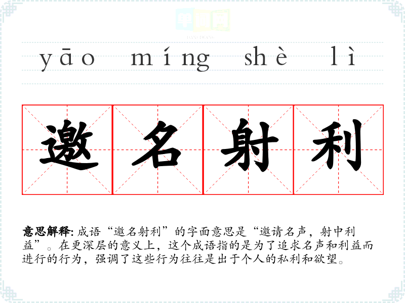 成语“邀名射利”的字面意思是“邀请名声,射中利益”。在更深层的意义上,这个成语指的是为了追求名声和利益而进行的行为,强调了这些行为往往是出于个人的私利和欲望。