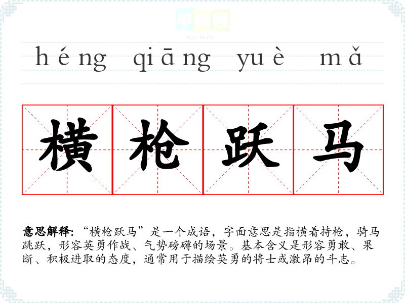 “横枪跃马”是一个成语,字面意思是指横着持枪,骑马跳跃,形容英勇作战、气势磅礴的场景。基本含义是形容勇敢、果断、积极进取的态度,通常用于描绘英勇的将士或激昂的斗志。