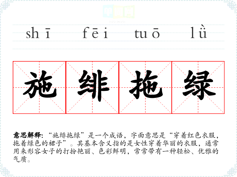 “施绯拖绿”是一个成语,字面意思是“穿着红色衣服,拖着绿色的裙子”。其基本含义指的是女性穿着华丽的衣服,通常用来形容女子的打扮艳丽、色彩鲜明,常常带有一种轻松、优雅的气质。