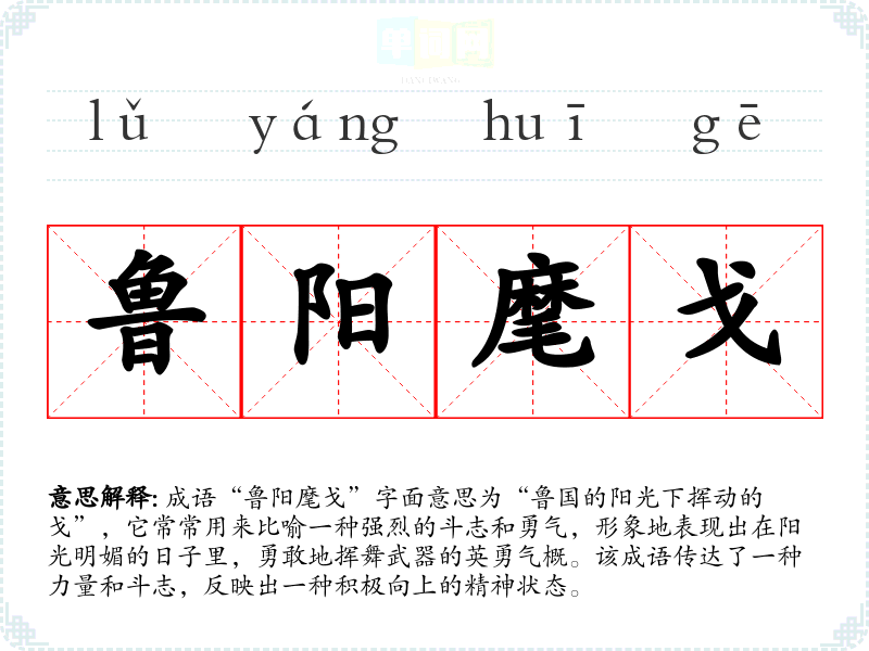 成语“鲁阳麾戈”字面意思为“鲁国的阳光下挥动的戈”,它常常用来比喻一种强烈的斗志和勇气,形象地表现出在阳光明媚的日子里,勇敢地挥舞武器的英勇气概。该成语传达了一种力量和斗志,反映出一种积极向上的精神状态。
