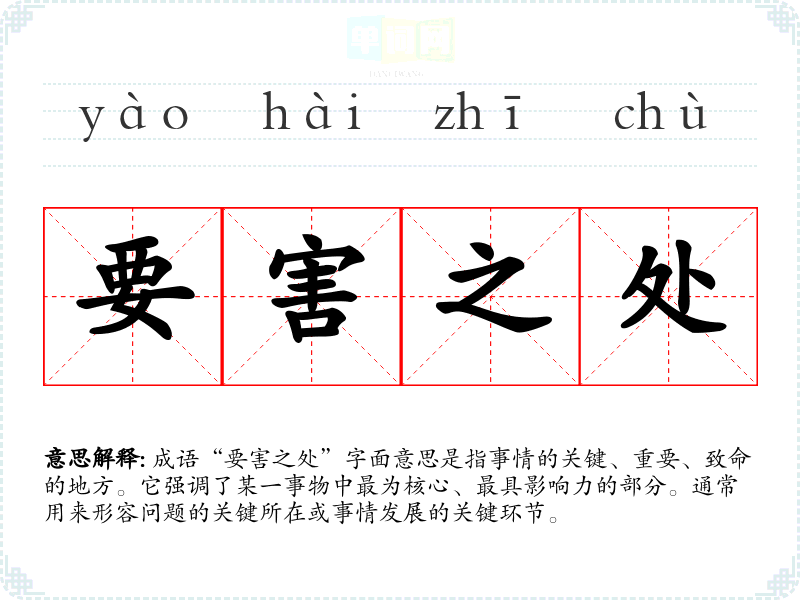成语“要害之处”字面意思是指事情的关键、重要、致命的地方。它强调了某一事物中最为核心、最具影响力的部分。通常用来形容问题的关键所在或事情发展的关键环节。