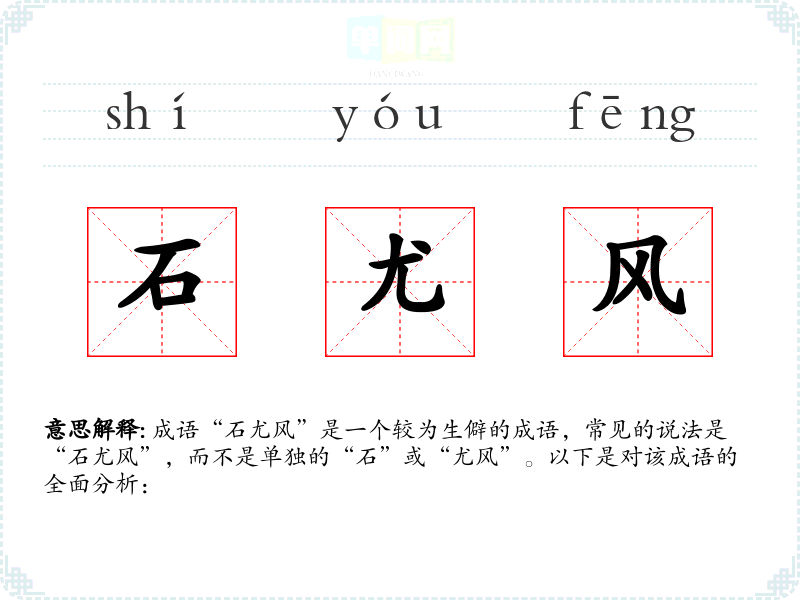 “石尤风”的字面意思可以理解为“石头在风中”。在传统文化中,石头通常象征着坚固、稳定,而“风”则代表变化和不确定性。因此,这个成语可以引申为在不稳定的环境中保持坚定的立场或态度。