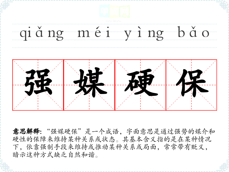 “强媒硬保”是一个成语,字面意思是通过强势的媒介和硬性的保障来维持某种关系或状态。其基本含义指的是在某种情况下,依靠强制手段来维持或推动某种关系或局面,常常带有贬义,暗示这种方式缺乏自然和谐。