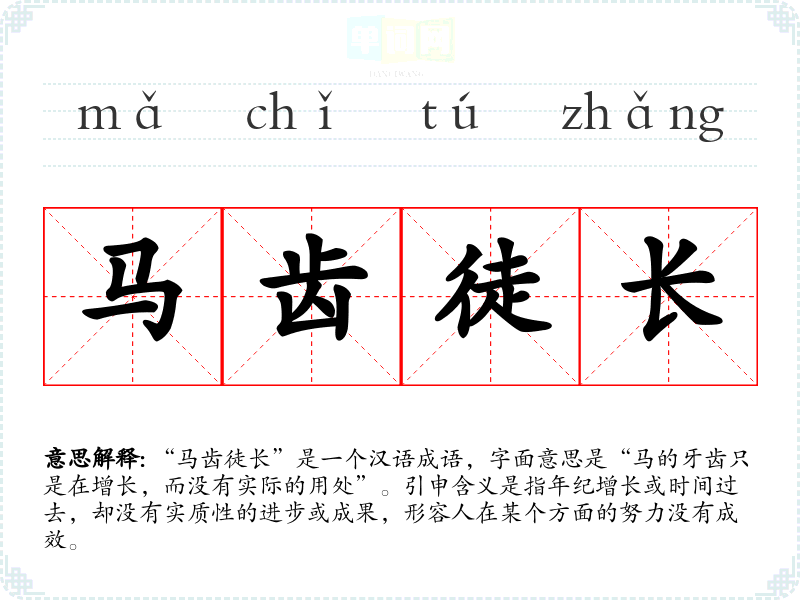 “马齿徒长”是一个汉语成语,字面意思是“马的牙齿只是在增长,而没有实际的用处”。引申含义是指年纪增长或时间过去,却没有实质性的进步或成果,形容人在某个方面的努力没有成效。