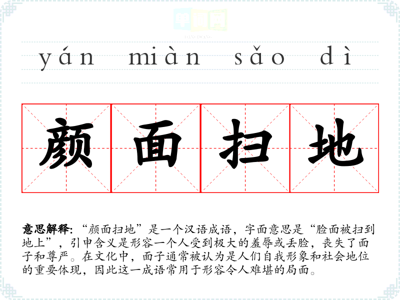 “颜面扫地”是一个汉语成语,字面意思是“脸面被扫到地上”,引申含义是形容一个人受到极大的羞辱或丢脸,丧失了面子和尊严。在文化中,面子通常被认为是人们自我形象和社会地位的重要体现,因此这一成语常用于形容令人难堪的局面。