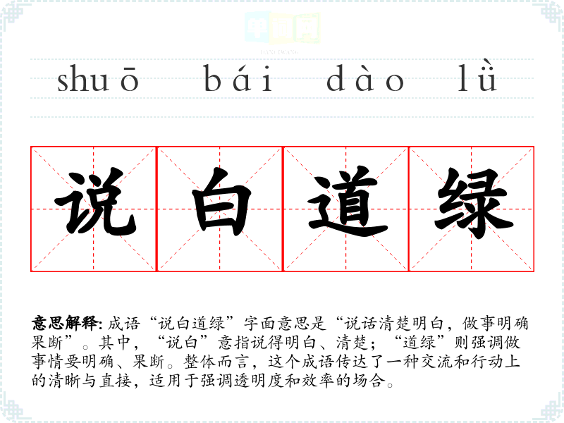 成语“说白道绿”字面意思是“说话清楚明白,做事明确果断”。其中,“说白”意指说得明白、清楚;“道绿”则强调做事情要明确、果断。整体而言,这个成语传达了一种交流和行动上的清晰与直接,适用于强调透明度和效率的场合。