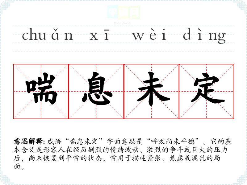 成语“喘息未定”字面意思是“呼吸尚未平稳”。它的基本含义是形容人在经历剧烈的情绪波动、激烈的争斗或巨大的压力后,尚未恢复到平常的状态,常用于描述紧张、焦虑或混乱的局面。