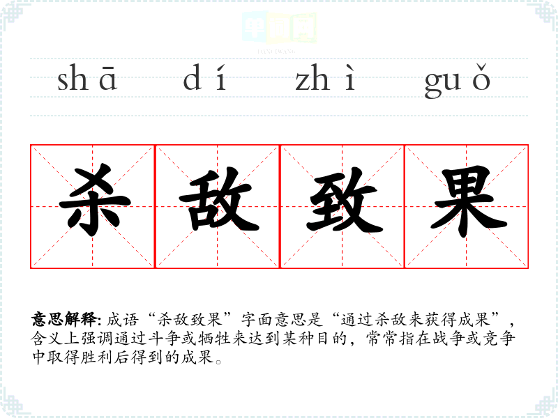 成语“杀敌致果”字面意思是“通过杀敌来获得成果”,含义上强调通过斗争或牺牲来达到某种目的,常常指在战争或竞争中取得胜利后得到的成果。