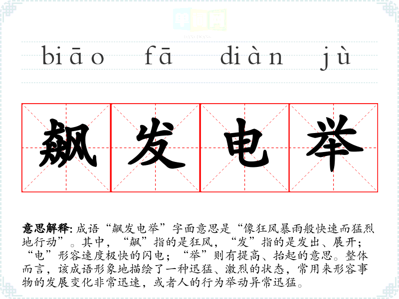 成语“飙发电举”字面意思是“像狂风暴雨般快速而猛烈地行动”。其中,“飙”指的是狂风,“发”指的是发出、展开;“电”形容速度极快的闪电;“举”则有提高、抬起的意思。整体而言,该成语形象地描绘了一种迅猛、激烈的状态,常用来形容事物的发展变化非常迅速,或者人的行为举动异常迅猛。