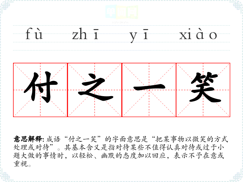 成语“付之一笑”的字面意思是“把某事物以微笑的方式处理或对待”。其基本含义是指对待某些不值得认真对待或过于小题大做的事情时,以轻松、幽默的态度加以回应,表示不予在意或重视。