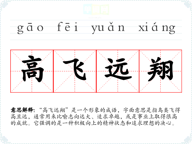 “高飞远翔”是一个形象的成语,字面意思是指鸟类飞得高且远,通常用来比喻志向远大、追求卓越,或是事业上取得很高的成就。它强调的是一种积极向上的精神状态和追求理想的决心。