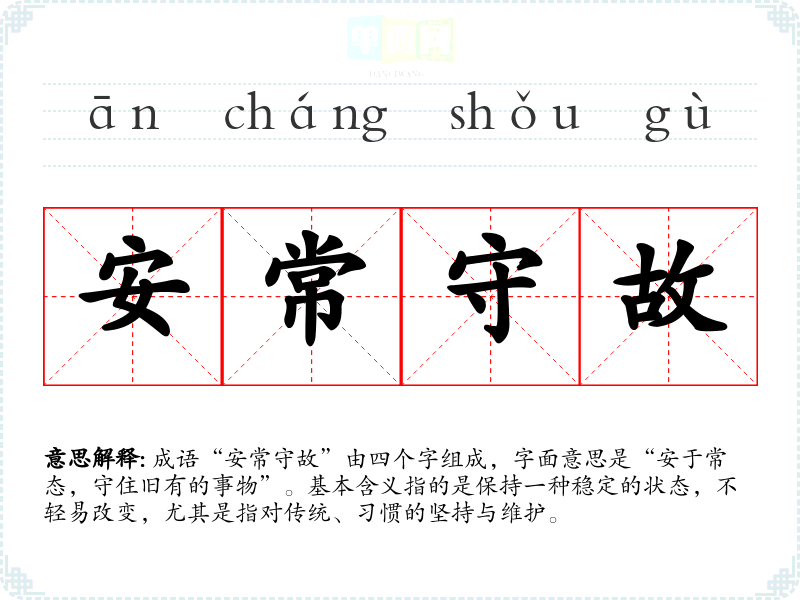 成语“安常守故”由四个字组成,字面意思是“安于常态,守住旧有的事物”。基本含义指的是保持一种稳定的状态,不轻易改变,尤其是指对传统、*惯的坚持与维护。