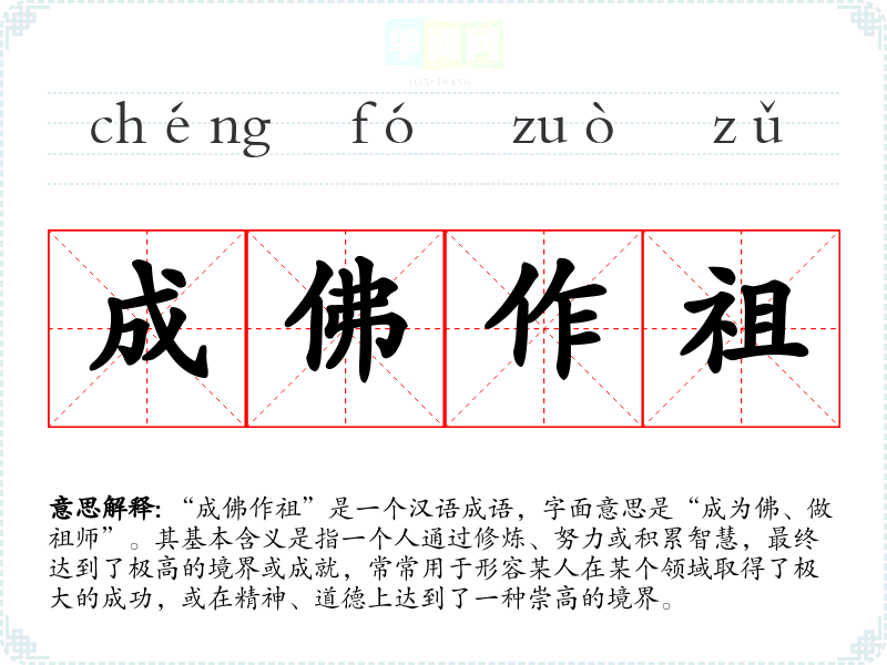 “成佛作祖”是一个汉语成语,字面意思是“成为佛、做祖师”。其基本含义是指一个人通过修炼、努力或积累智慧,最终达到了极高的境界或成就,常常用于形容某人在某个领域取得了极大的成功,或在精神、道德上达到了一种崇高的境界。