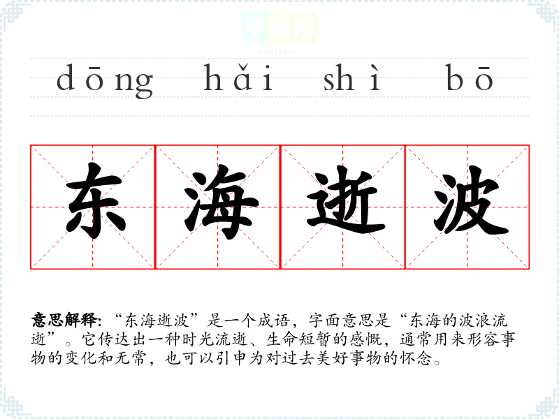“东海逝波”是一个成语,字面意思是“东海的波浪流逝”。它传达出一种时光流逝、生命短暂的感慨,通常用来形容事物的变化和无常,也可以引申为对过去美好事物的怀念。