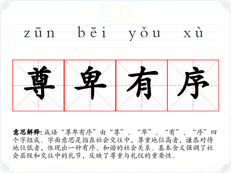 | 尊卑有序 | 尊:地位或辈分高,与“卑”相对;序:次第。指尊卑之间有严格的顺序 |