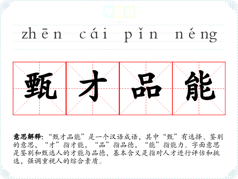 “甄才品能”是一个汉语成语,其中“甄”有选择、鉴别的意思,“才”指才能,“品”指品德,“能”指能力。字面意思是鉴别和甄选人的才能与品德,基本含义是指对人才进行评估和挑选,强调重视人的综合素质。