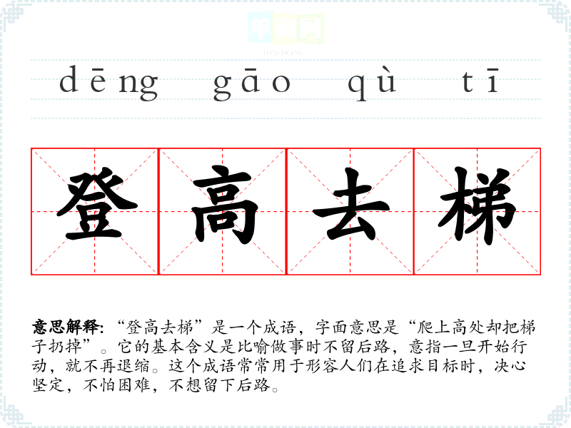 “登高去梯”是一个成语,字面意思是“爬上高处却把梯子扔掉”。它的基本含义是比喻做事时不留后路,意指一旦开始行动,就不再退缩。这个成语常常用于形容人们在追求目标时,决心坚定,不怕困难,不想留下后路。