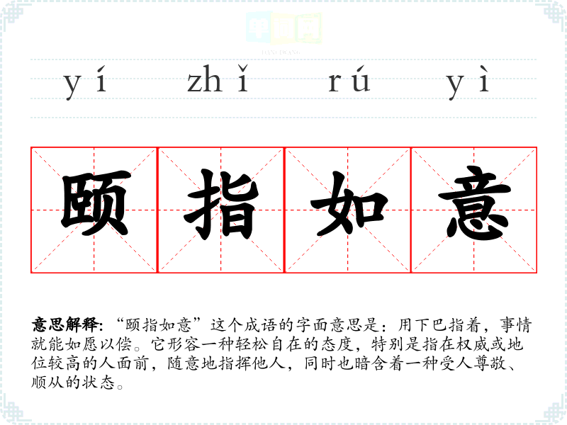 “颐指如意”这个成语的字面意思是:用下巴指着,事情就能如愿以偿。它形容一种轻松自在的态度,特别是指在权威或地位较高的人面前,随意地指挥他人,同时也暗含着一种受人尊敬、顺从的状态。