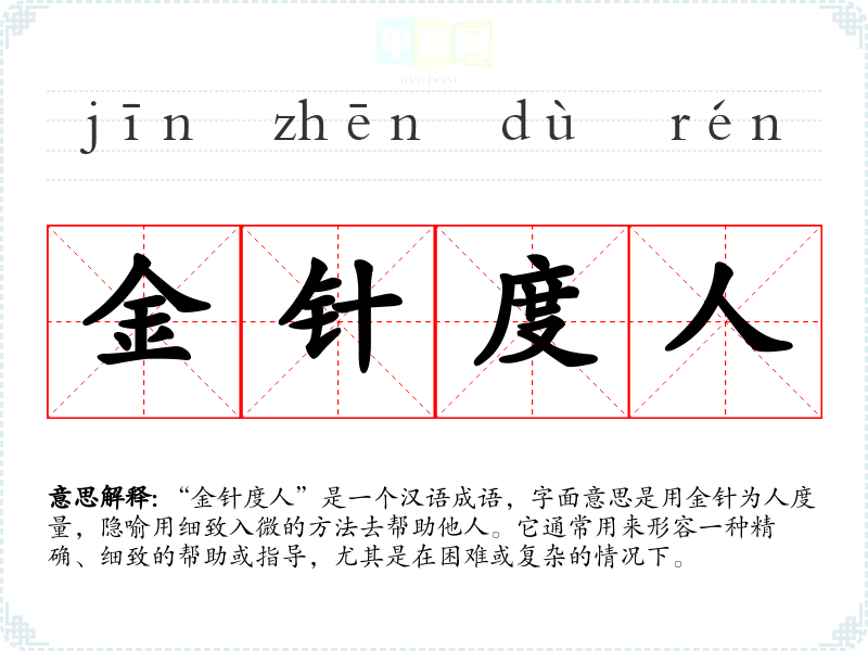 “金针度人”是一个汉语成语,字面意思是用金针为人度量,隐喻用细致入微的方法去帮助他人。它通常用来形容一种精确、细致的帮助或指导,尤其是在困难或复杂的情况下。