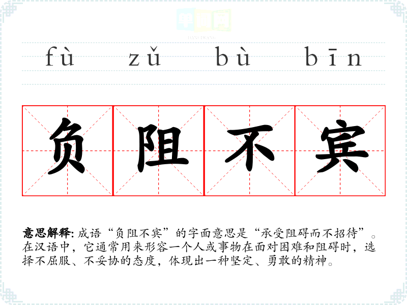 成语“负阻不宾”的字面意思是“承受阻碍而不招待”。在汉语中,它通常用来形容一个人或事物在面对困难和阻碍时,选择不屈服、不妥协的态度,体现出一种坚定、勇敢的精神。