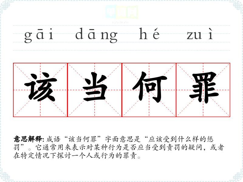“该当何罪”出自《大元大一统志》中的一段描述,反映了元代对法律与责任的认识。其典故与古代司法审判有关,强调在法治社会中对行为后果的明确界定。