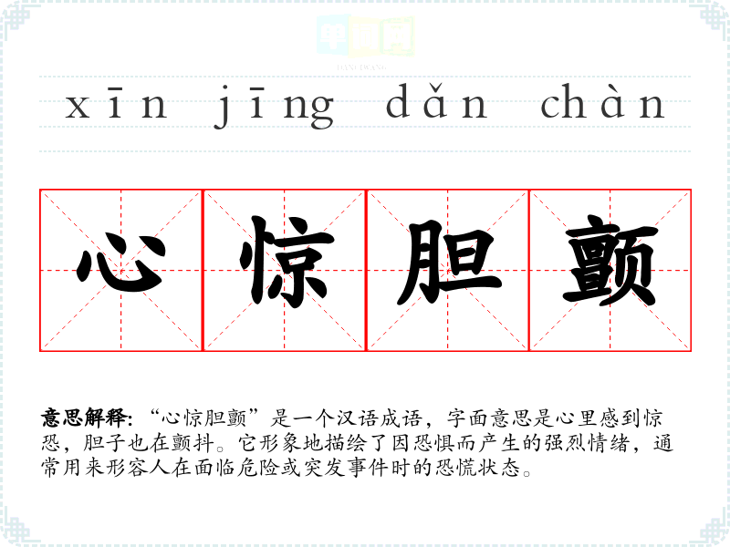 “心惊胆颤”是一个汉语成语,字面意思是心里感到惊恐,胆子也在颤抖。它形象地描绘了因恐惧而产生的强烈情绪,通常用来形容人在面临危险或突发**时的恐慌状态。