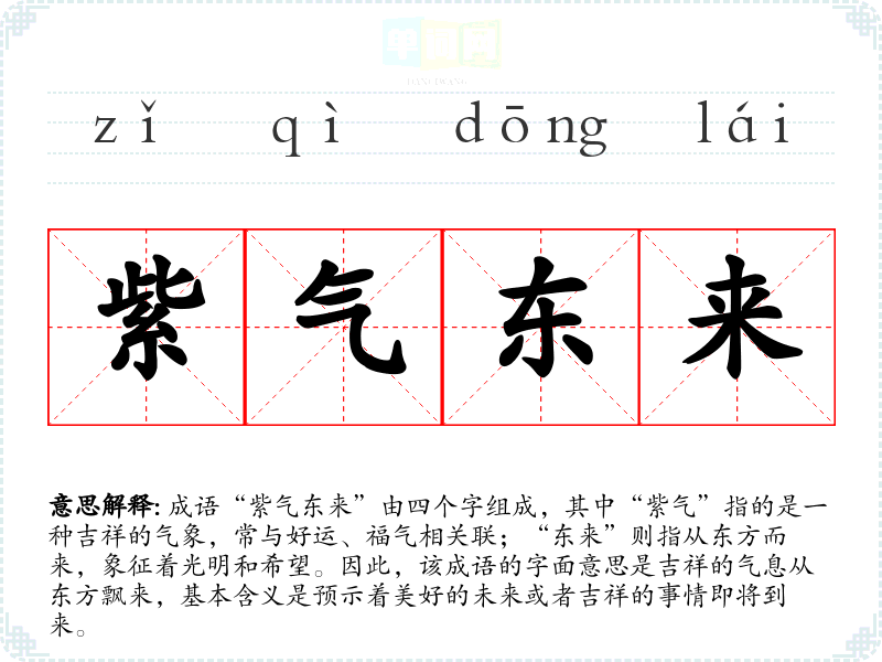 成语“紫气东来”由四个字组成,其中“紫气”指的是一种吉祥的气象,常与好运、福气相关联;“东来”则指从东方而来,象征着光明和希望。因此,该成语的字面意思是吉祥的气息从东方飘来,基本含义是预示着美好的未来或者吉祥的事情即将到来。