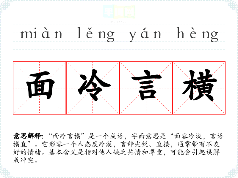“面冷言横”是一个成语,字面意思是“面容冷淡,言语横直”。它形容一个人态度冷漠,言辞尖锐、直接,通常带有不友好的情绪。基本含义是指对他人缺乏热情和尊重,可能会引起误解或冲突。
