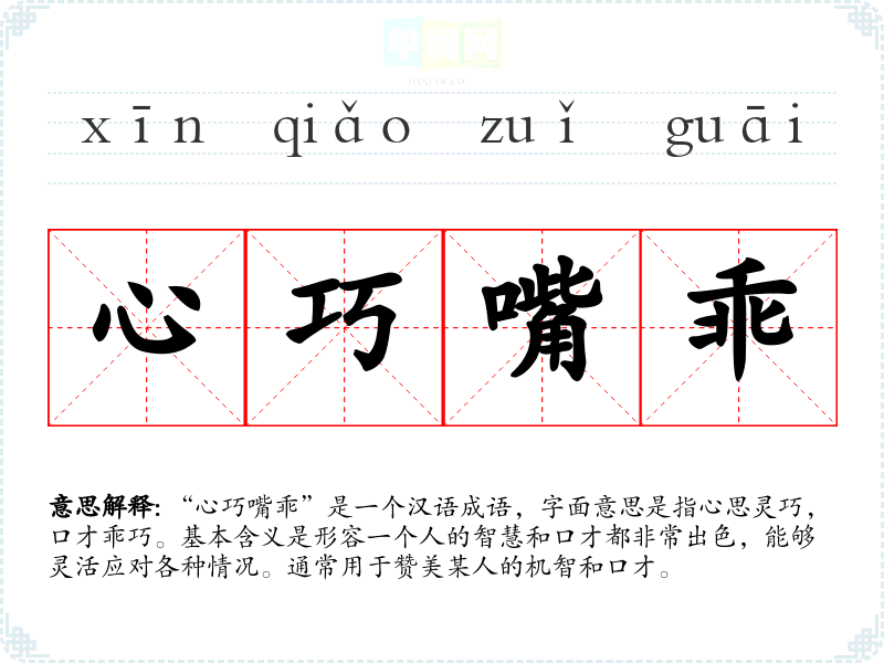 “心巧嘴乖”并没有明确的历史典故或文学出处,但可以从字面构成理解其含义。成语中的“心巧”指的是思维敏捷、聪明,而“嘴乖”则是指口才好、能言善辩。这种描述反映了古代对聪明才智和口才的重视,体现了智慧与表达能力的结合。