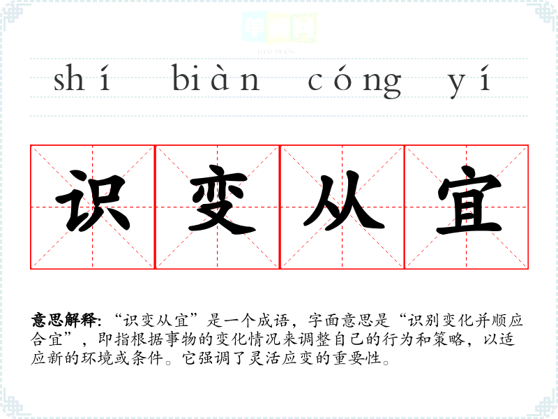 “识变从宜”是一个成语,字面意思是“识别变化并顺应合宜”,即指根据事物的变化情况来调整自己的行为和策略,以适应新的环境或条件。它强调了灵活应变的重要性。