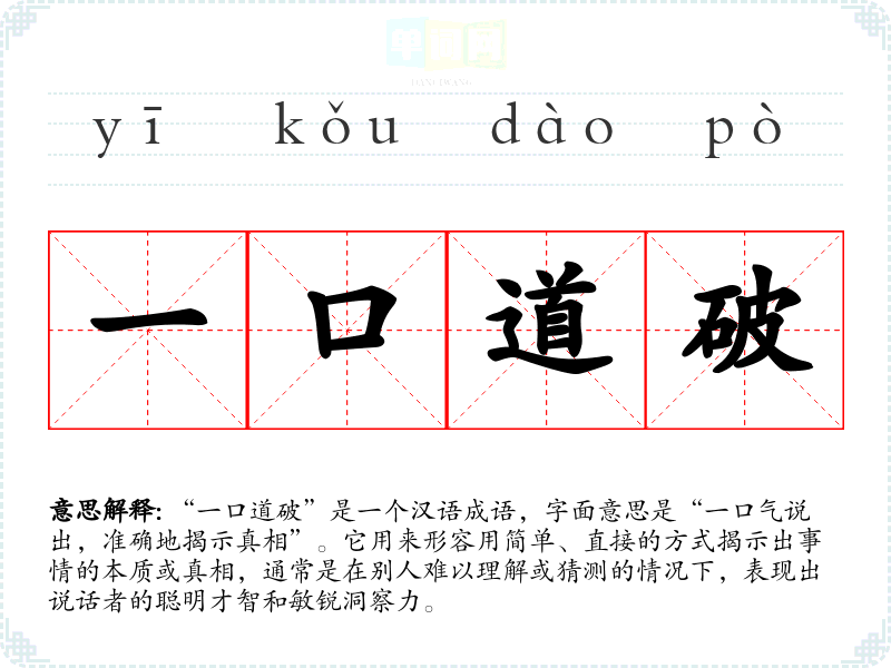 “一口道破”是一个汉语成语,字面意思是“一口气说出,准确地揭示真相”。它用来形容用简单、直接的方式揭示出事情的本质或真相,通常是在别人难以理解或猜测的情况下,表现出说话者的聪明才智和敏锐洞察力。