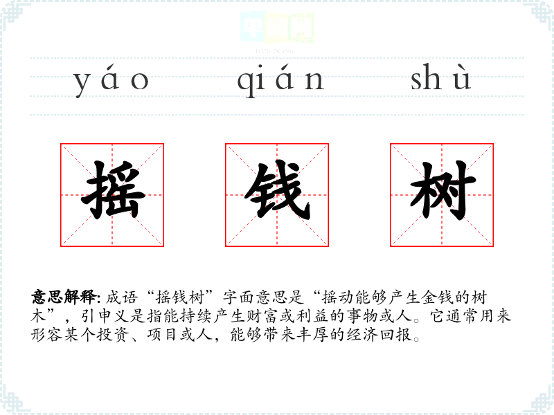成语“摇钱树”字面意思是“摇动能够产生金钱的树木”,引申义是指能持续产生财富或利益的事物或人。它通常用来形容某个投资、项目或人,能够带来丰厚的经济回报。