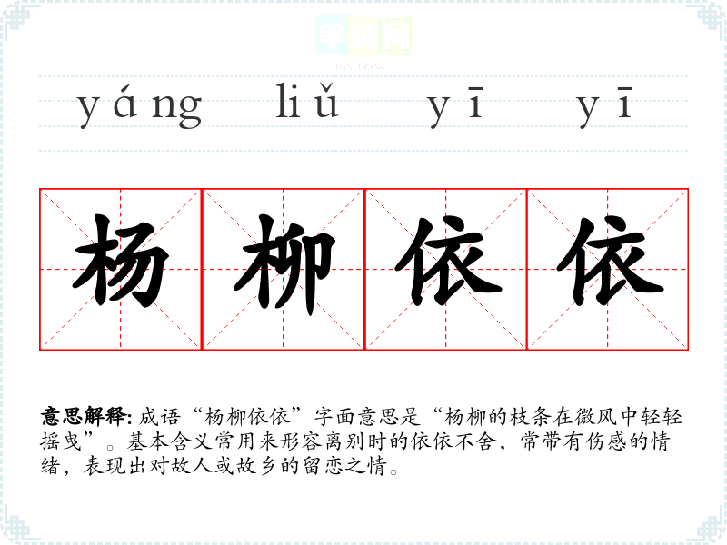 成语“杨柳依依”字面意思是“杨柳的枝条在微风中轻轻摇曳”。基本含义常用来形容离别时的依依不舍,常带有伤感的情绪,表现出对故人或故乡的留恋之情。