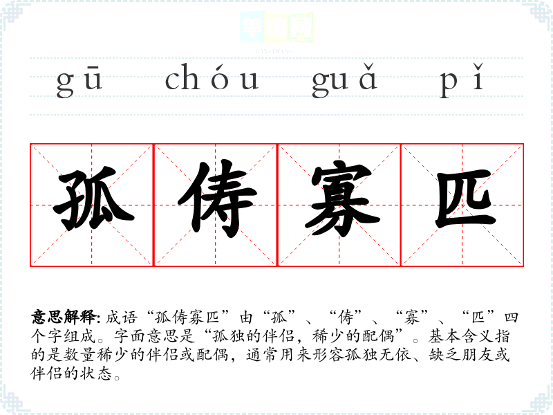 成语“孤俦寡匹”由“孤”、“俦”、“寡”、“匹”四个字组成。字面意思是“孤独的伴侣,稀少的配偶”。基本含义指的是数量稀少的伴侣或配偶,通常用来形容孤独无依、缺乏朋友或伴侣的状态。