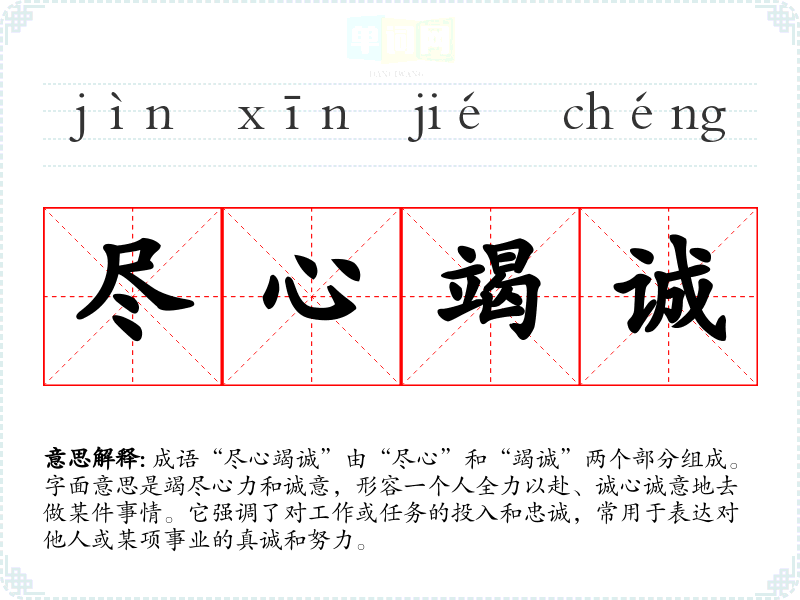 成语“尽心竭诚”由“尽心”和“竭诚”两个部分组成。字面意思是竭尽心力和诚意,形容一个人全力以赴、诚心诚意地去做某件事情。它强调了对工作或任务的投入和忠诚,常用于表达对他人或某项事业的真诚和努力。