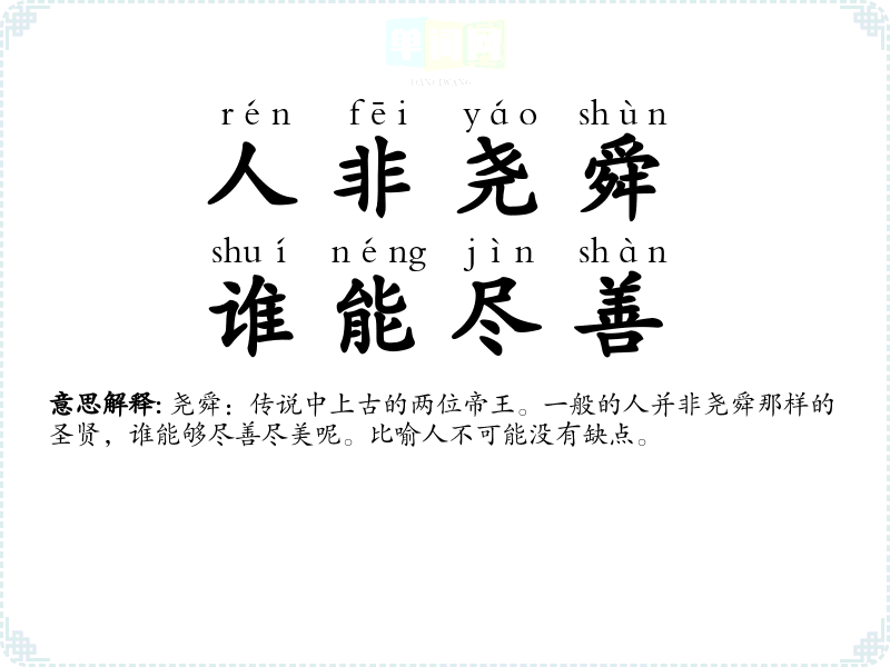 | 人非尧舜,谁能尽善 | 尧舜:传说中上古的两位帝王。一般的人并非尧舜那样的圣贤,谁能够尽善尽美呢。比喻人不可能没有缺点。 |