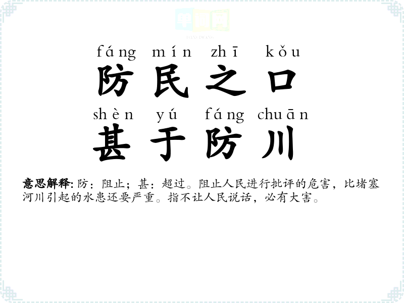 | 防人之口,甚于防川 | 防:阻止;甚:超过;川:河流。想堵住人民的嘴,比堵塞河川还难。指不让人民说话,是不明智的。 |