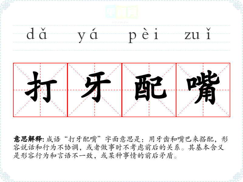成语“打牙配嘴”字面意思是:用牙齿和嘴巴来搭配,形容说话和行为不协调,或者做事时不考虑前后的关系。其基本含义是形容行为和言语不一致,或某种事情的前后矛盾。
