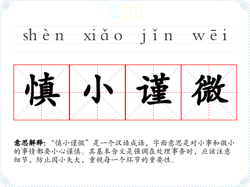 “慎小谨微”是一个汉语成语,字面意思是对小事和微小的事情都要小心谨慎。其基本含义是强调在处理事务时,应该注意细节,防止因小失大,重视每一个环节的重要性。