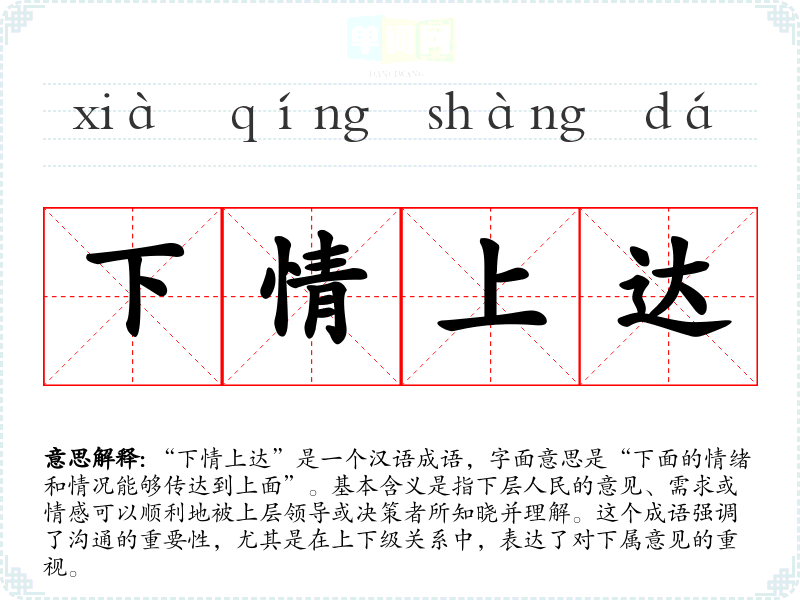“下情上达”给人一种积极的情感反应,体现了对沟通与理解的重视。它让我联想到在工作或生活中,良好的沟通能够促进理解和合作。这个成语也提醒我,在与他人交流时,倾听和反馈是多么的重要。
