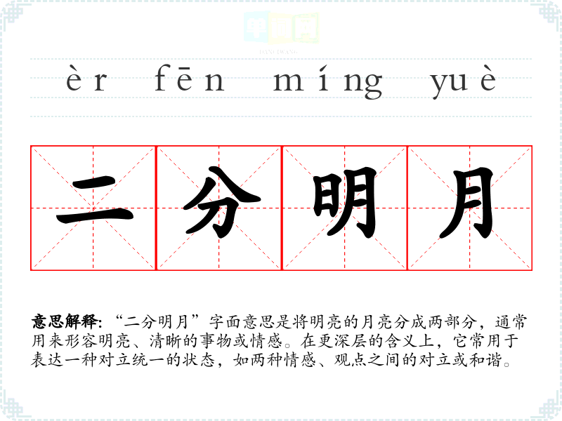 “二分明月”字面意思是将明亮的月亮分成两部分,通常用来形容明亮、清晰的事物或情感。在更深层的含义上,它常用于表达一种对立统一的状态,如两种情感、观点之间的对立或和谐。