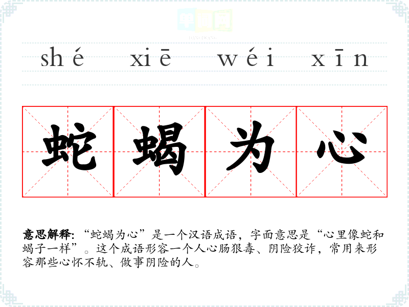 “蛇蝎为心”是一个汉语成语,字面意思是“心里像蛇和蝎子一样”。这个成语形容一个人心肠狠毒、阴险狡诈,常用来形容那些心怀不轨、做事阴险的人。