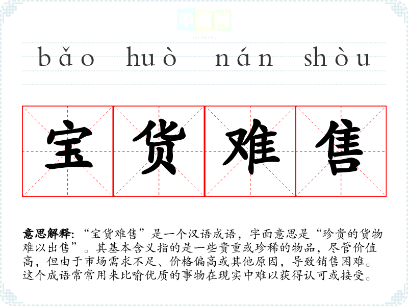 “宝货难售”并没有明确的历史典故或文学出处,但可以推测其形成背景与古代商业活动、市场经济相关。古代社会中,珍贵的物品往往被视为稀有的财富,然而在供求关系不平衡的情况下,这些物品的流通和交易就会遇到困难。