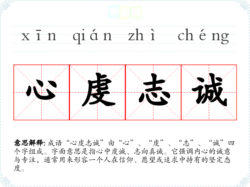 成语“心虔志诚”由“心”、“虔”、“志”、“诚”四个字组成。字面意思是指心中虔诚、志向真诚。它强调内心的诚意与专注,通常用来形容一个人在信仰、愿望或追求中持有的坚定态度。