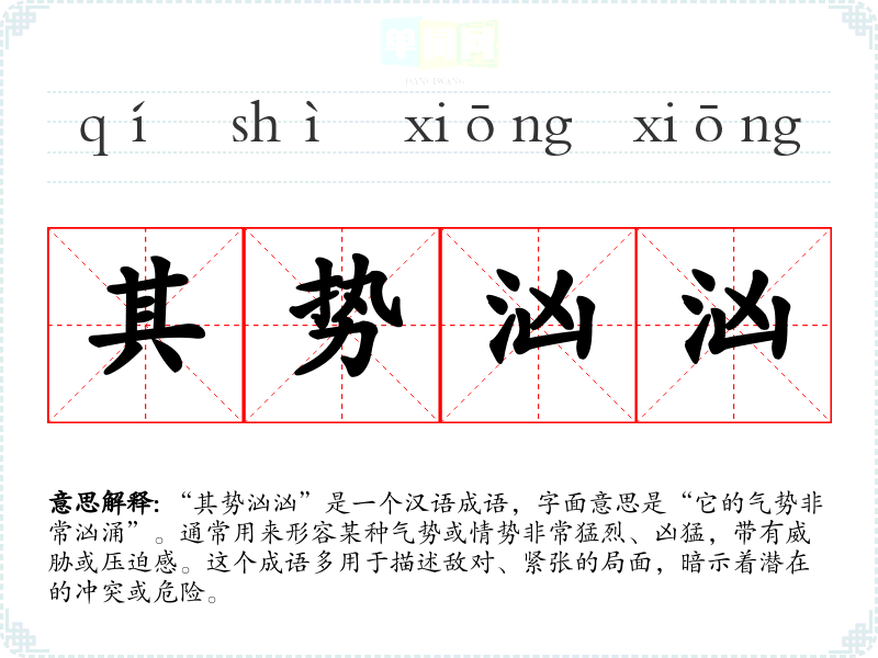 “其势汹汹”是一个汉语成语,字面意思是“它的气势非常汹涌”。通常用来形容某种气势或情势非常猛烈、凶猛,带有威胁或压迫感。这个成语多用于描述敌对、紧张的局面,暗示着潜在的冲突或危险。