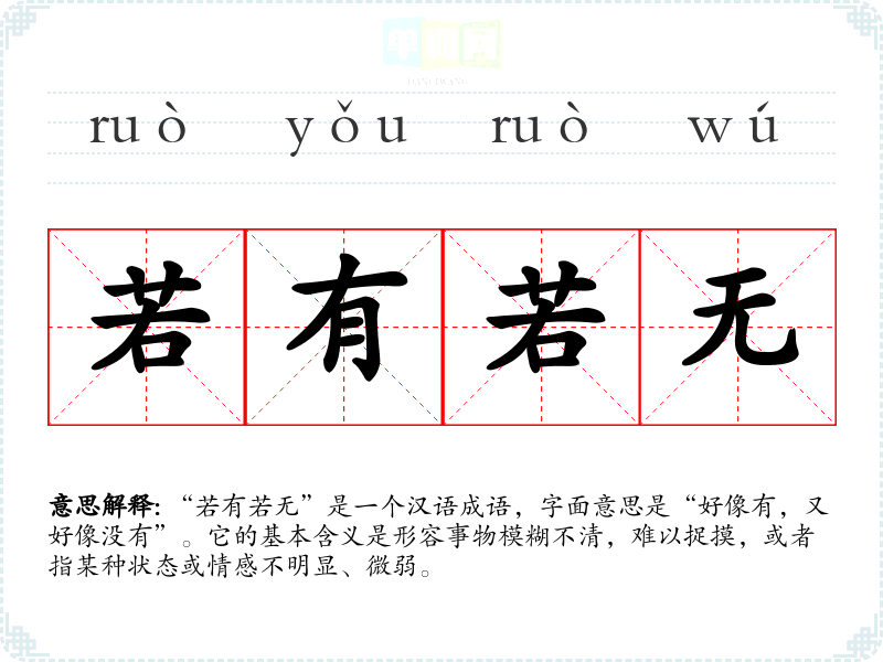 “若有若无”是一个汉语成语,字面意思是“好像有,又好像没有”。它的基本含义是形容事物模糊不清,难以捉摸,或者指某种状态或情感不明显、微弱。