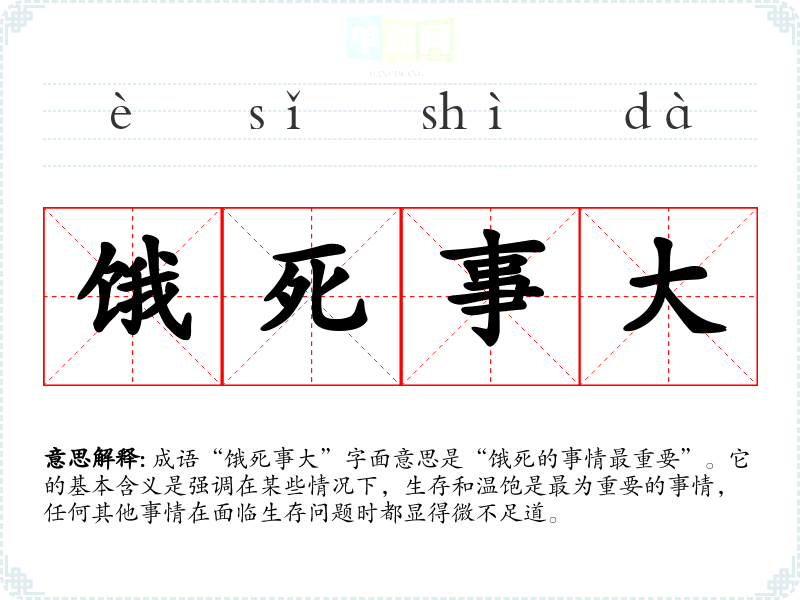 “饿死事大”这一成语源于**古代的历史背景,尤其是在经历饥荒、战争或其他灾难时,生存问题常常被摆在首位。这个成语常被用来表达在紧急情况下,尤其是与食物和生存相关的问题是最为紧迫的。具体的历史典故不详,但可以联想到古代文人对生存与道德、理想之间关系的讨论。