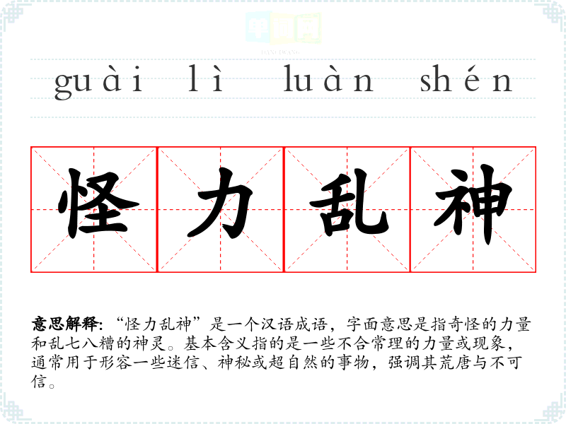 “怪力乱神”是一个汉语成语,字面意思是指奇怪的力量和乱七八糟的神灵。基本含义指的是一些不合常理的力量或现象,通常用于形容一些迷信、神秘或超自然的事物,强调其荒唐与不可信。