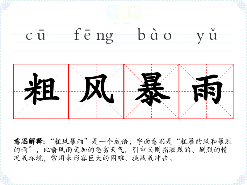 “粗风暴雨”是一个成语,字面意思是“粗暴的风和暴烈的雨”,比喻风雨交加的恶劣天气。引申义则指激烈的、剧烈的情况或环境,常用来形容巨大的困难、挑战或冲击。