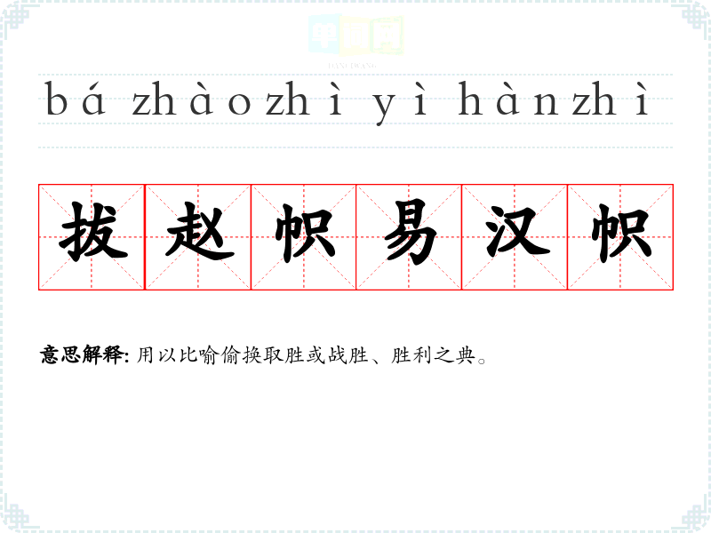 | 拔赵易汉 | 用以比喻偷换取胜或战胜、胜利之典。 |